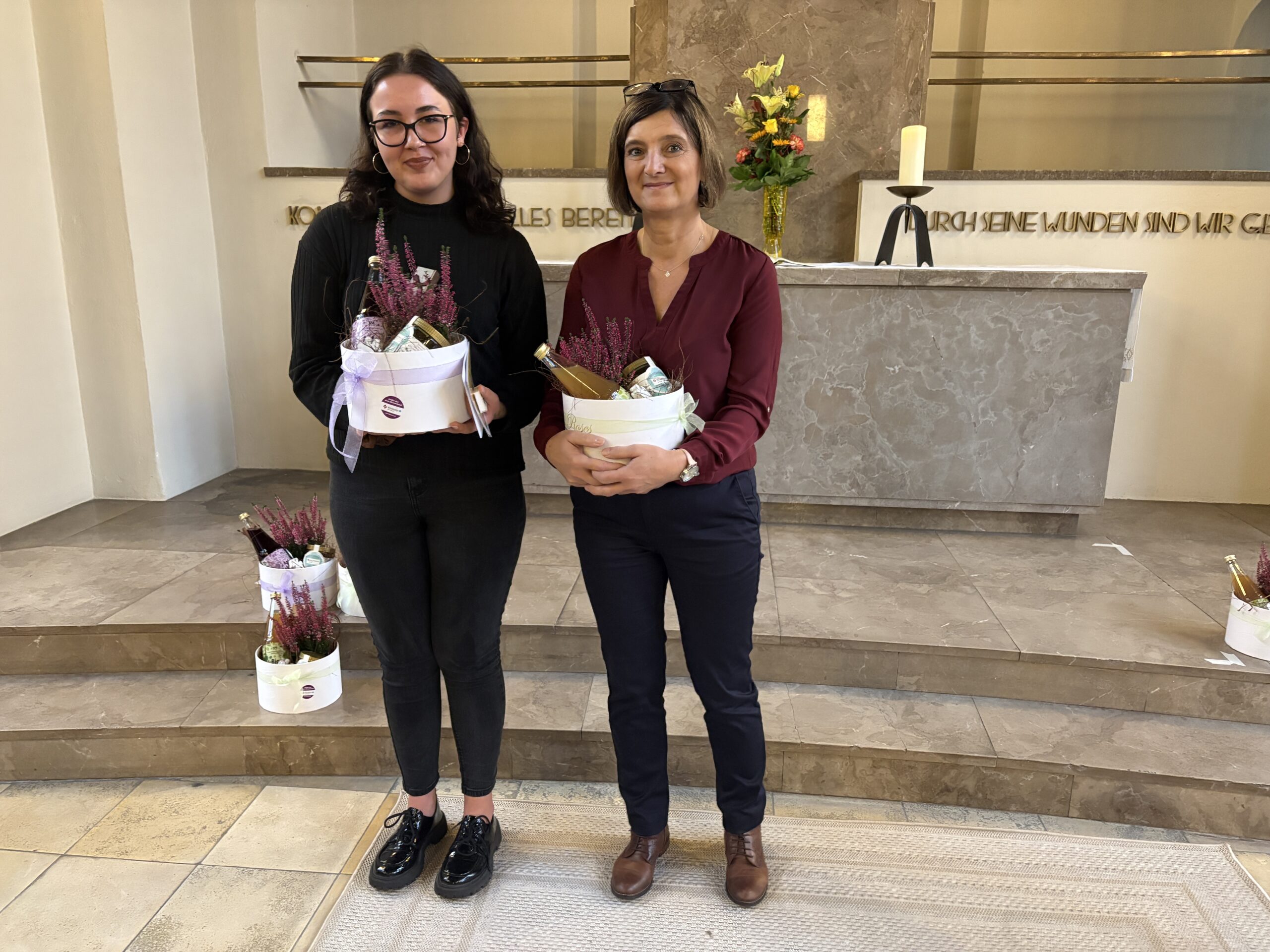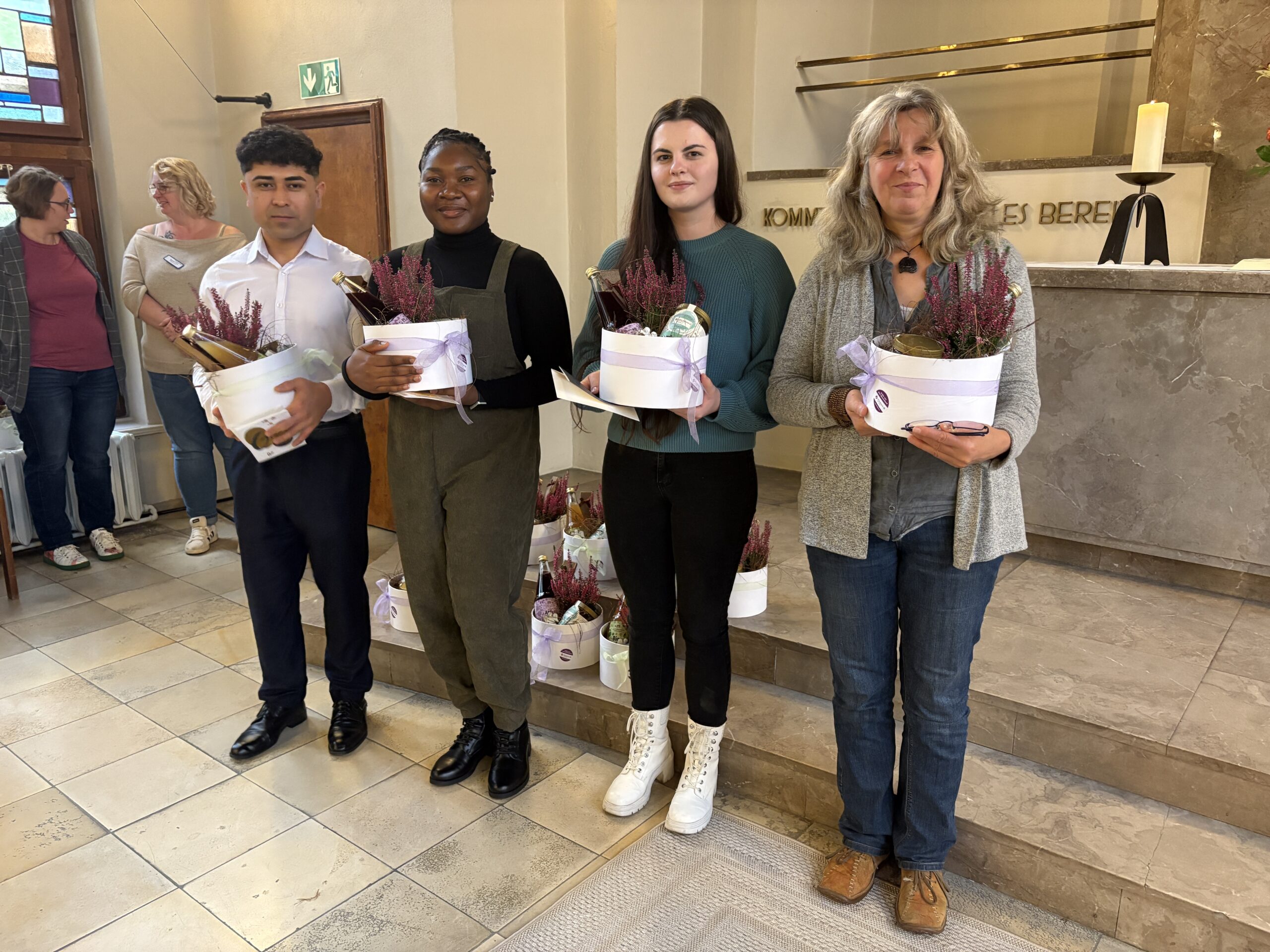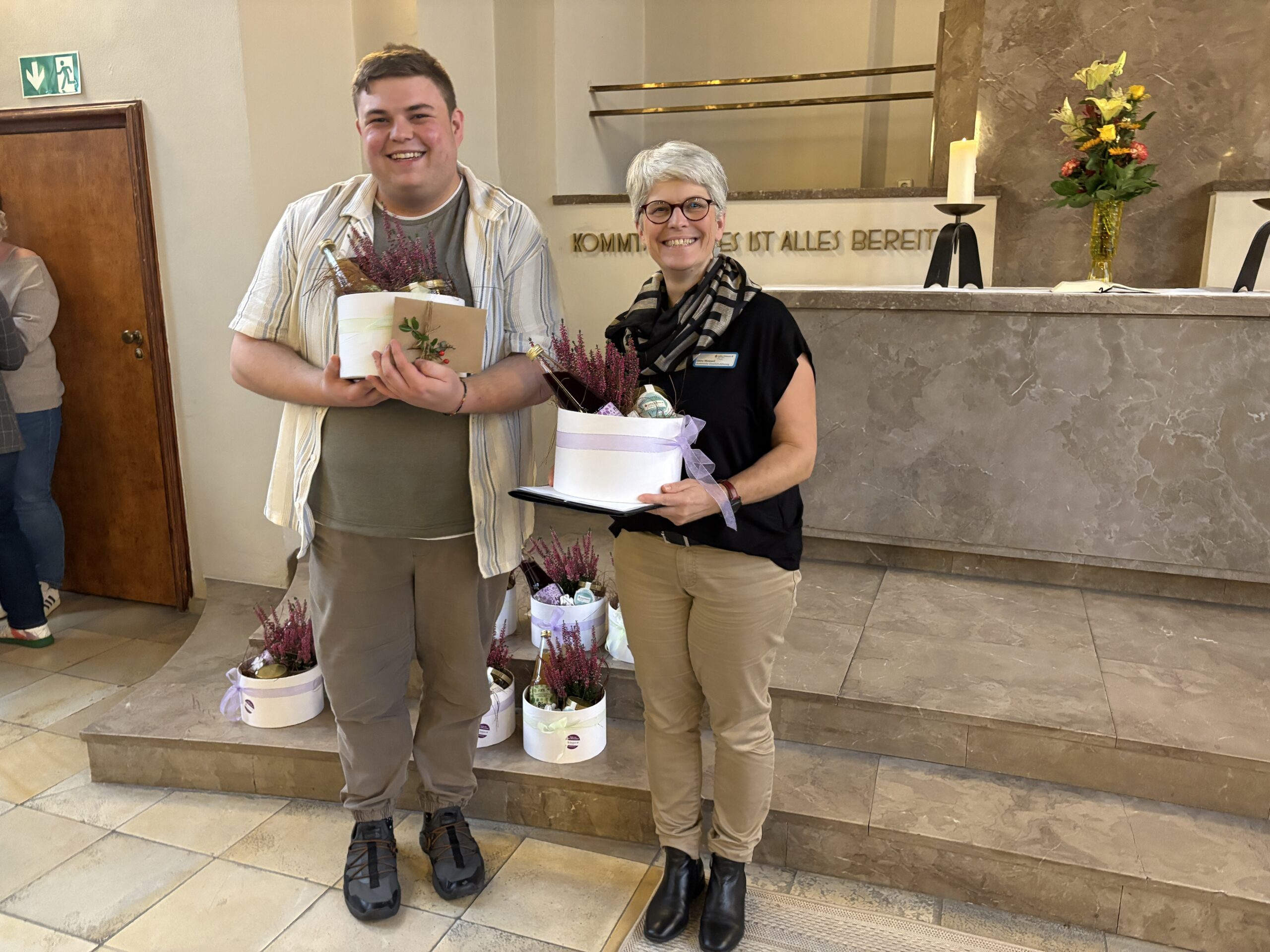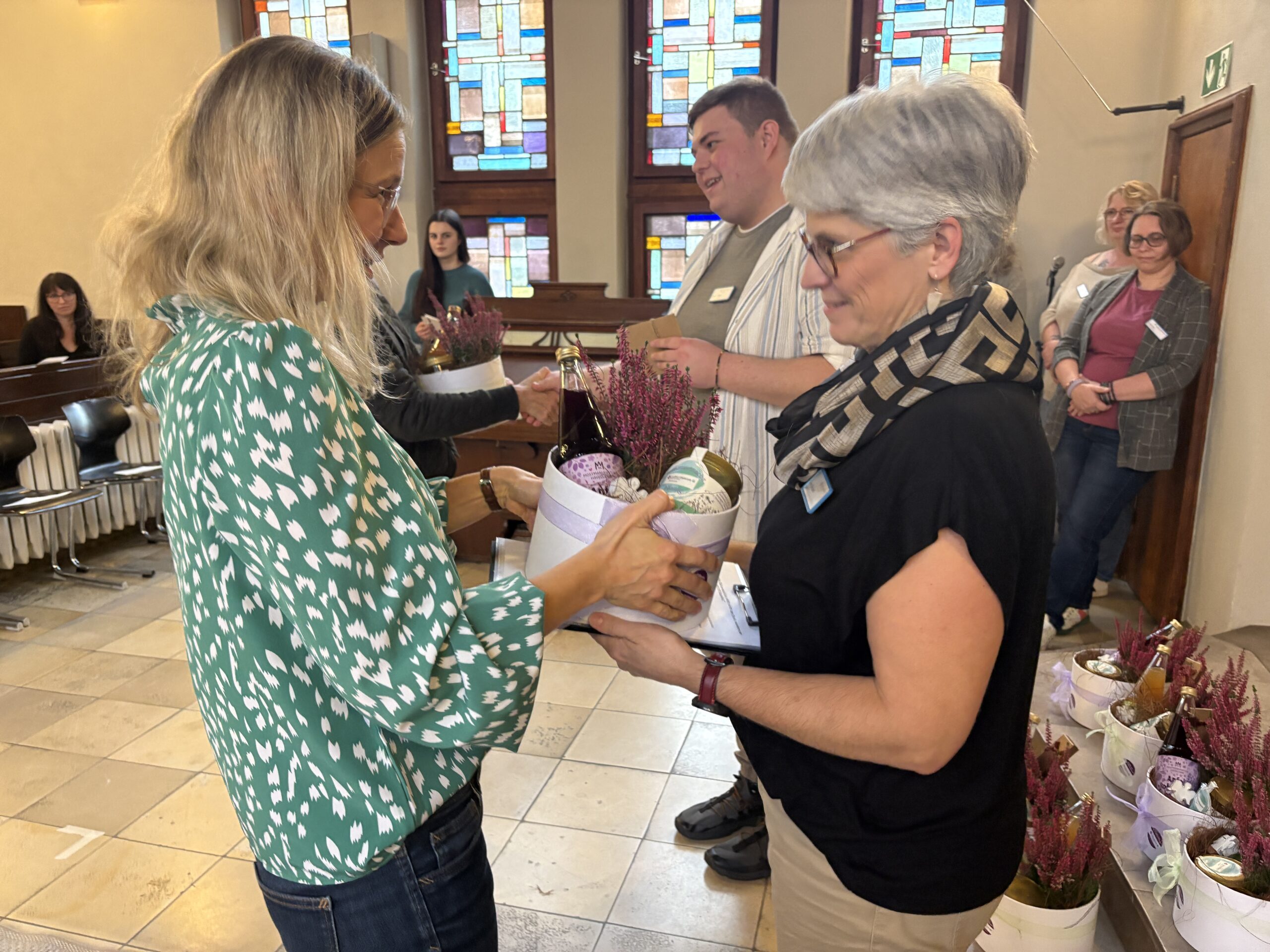 Nach einer Andacht mit Sabine Papies folgten persönliche Dankesworte, verfasst von Mitarbeitenden und Ausbildungsbegleitern. Die Präsentkörbe wurden liebevoll von Mitarbeiter:innen der LDT mit regionalen Produkten, selbst produziertem Honig und hergestellten Keramikengeln aus dem Werkstattbetrieb zusammengestellt.