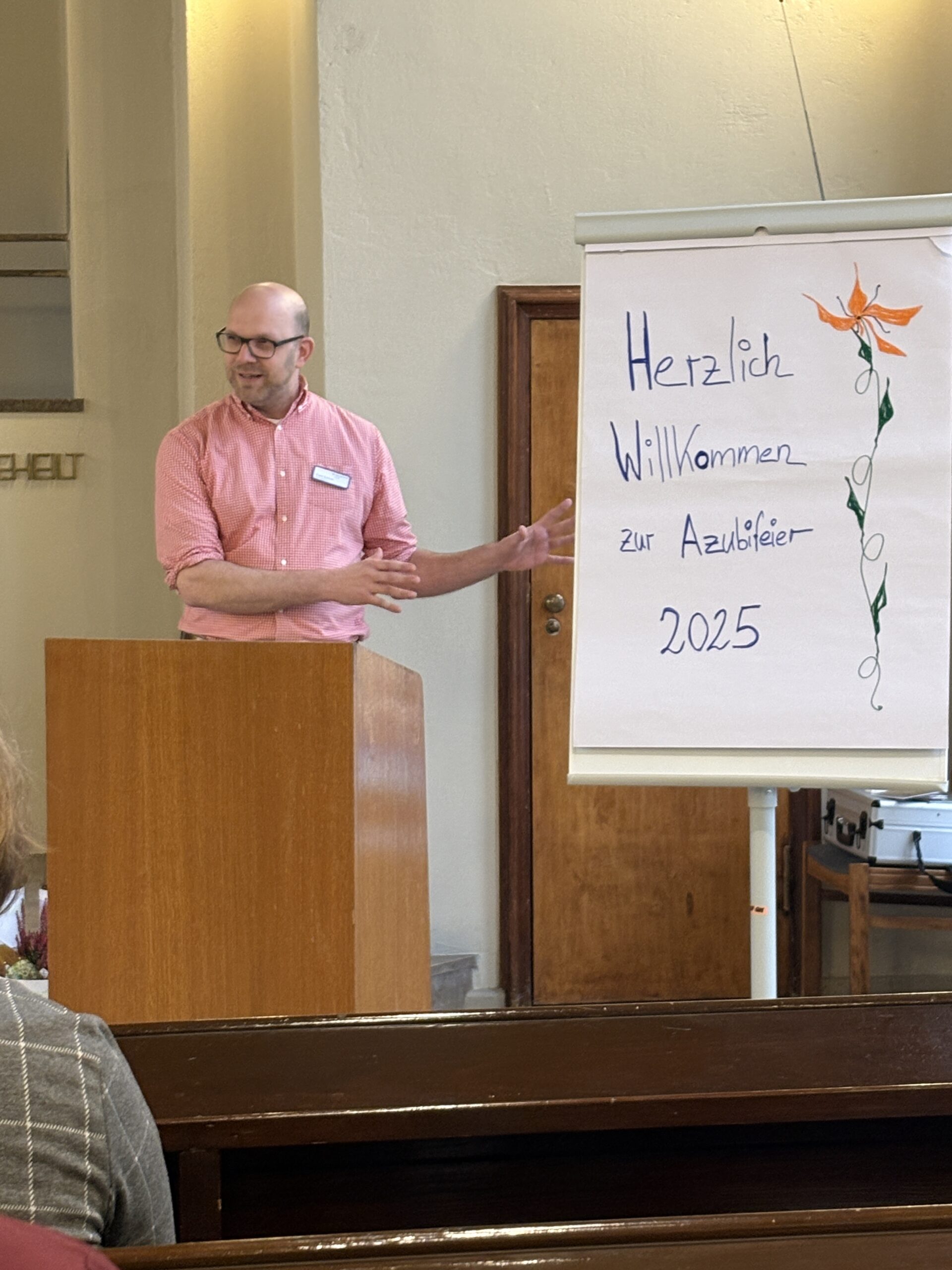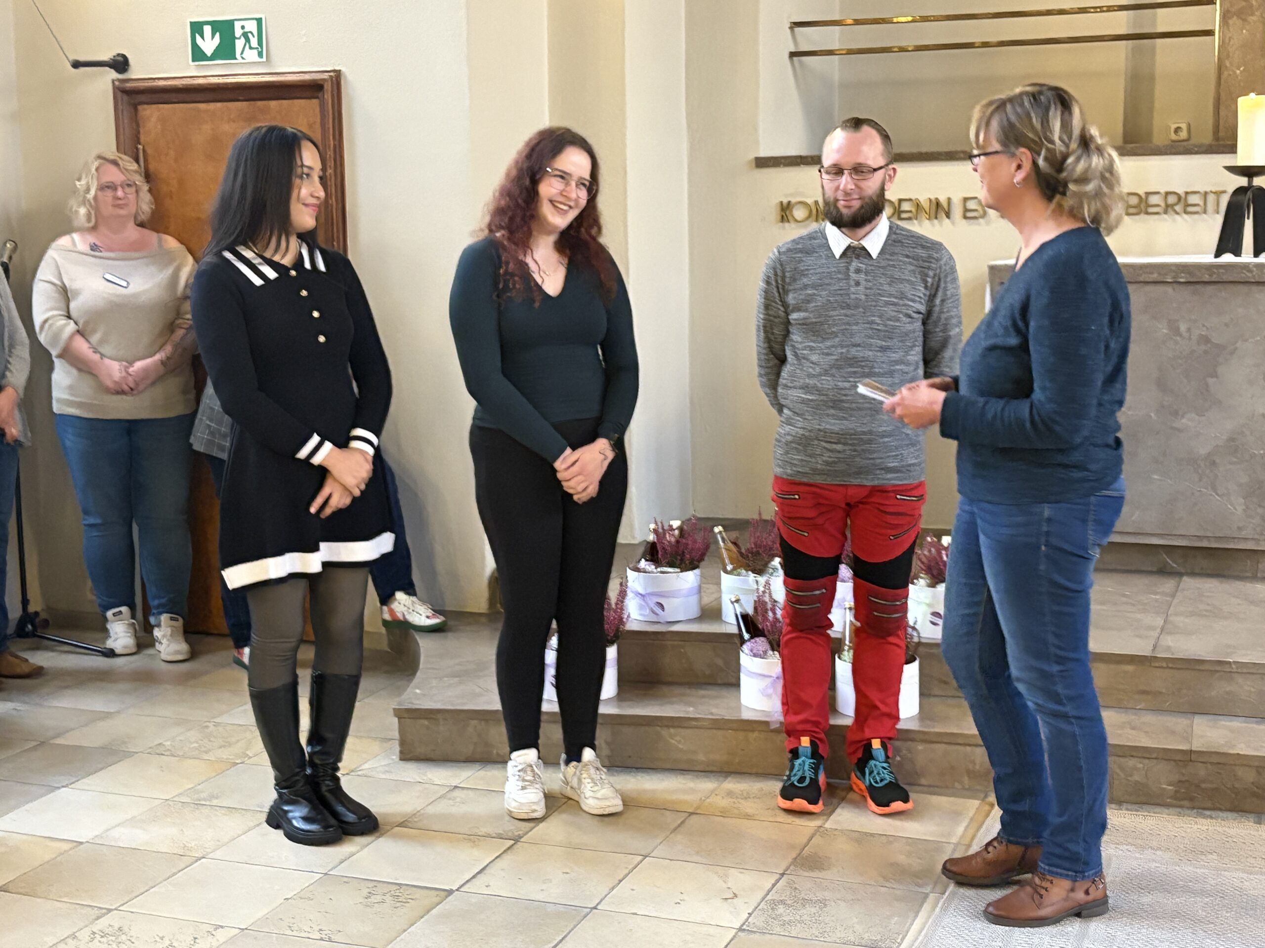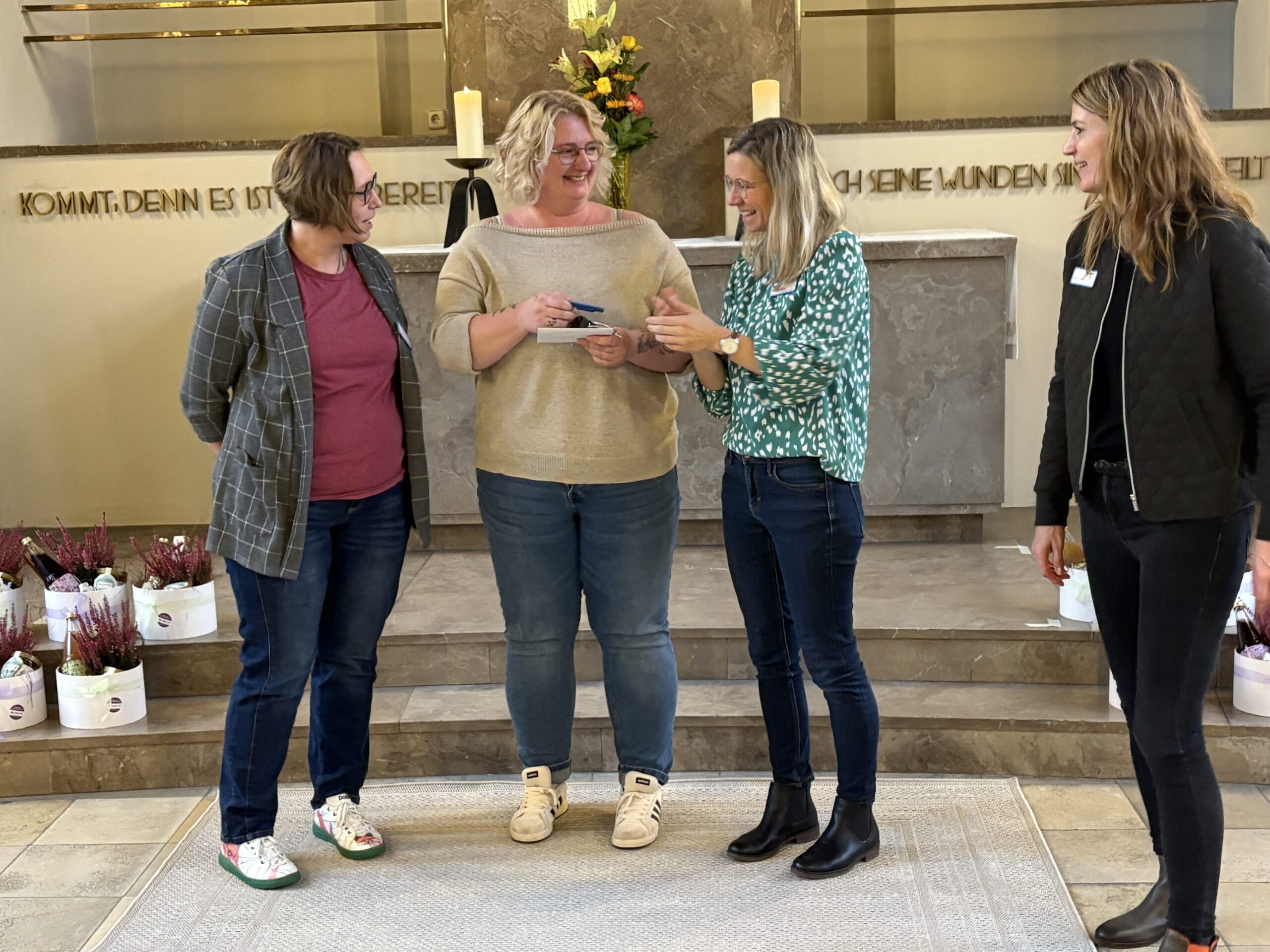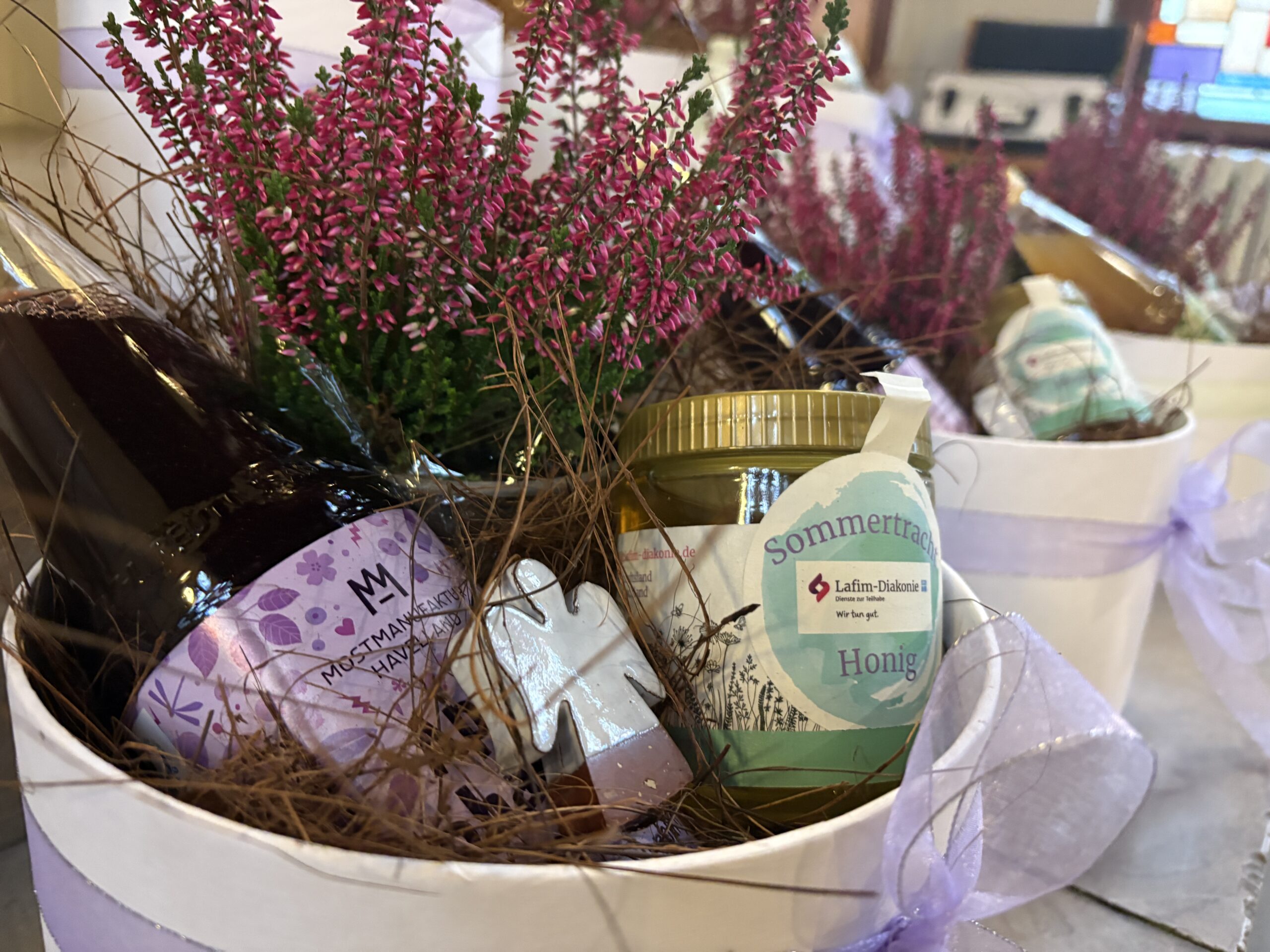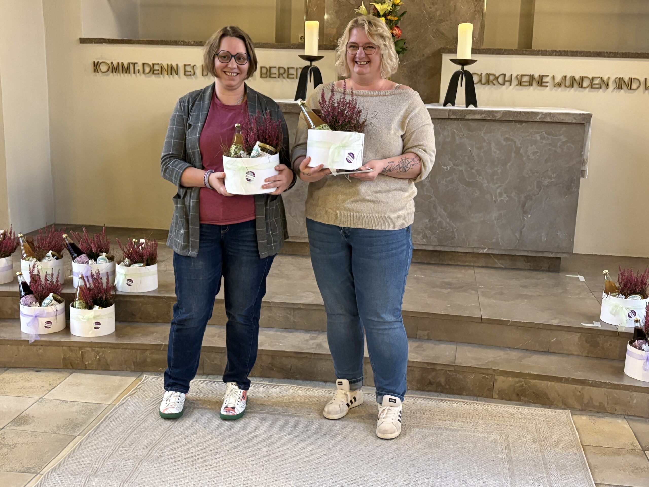 Nach einer Andacht mit Sabine Papies folgten persönliche Dankesworte, verfasst von Mitarbeitenden und Ausbildungsbegleitern. Die Präsentkörbe wurden liebevoll von Mitarbeiter:innen der LDT mit regionalen Produkten, selbst produziertem Honig und hergestellten Keramikengeln aus dem Werkstattbetrieb zusammengestellt.